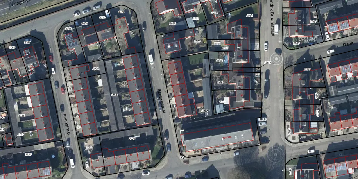 Het perceel waarop Beatrixstraat 6 staat heeft een oppervlakte van 1840 m². Dit is een zeer groot perceel. De perceeloppervlakte wordt geregistreerd door het Kadaster. Gedetailleerde informatie over de maten van dit perceel kunt u vinden in het rapport Kadastrale kaart met maatvoering van Beatrixstraat 6.