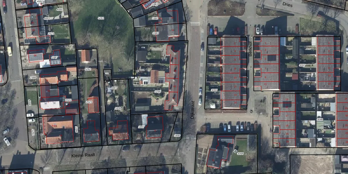 Het perceel waarop Dijkstraat 40 staat heeft een oppervlakte van 1273 m². Dit is een zeer groot perceel. De perceeloppervlakte wordt geregistreerd door het Kadaster. Gedetailleerde informatie over de maten van dit perceel kunt u vinden in het rapport Kadastrale kaart met maatvoering van Dijkstraat 40.