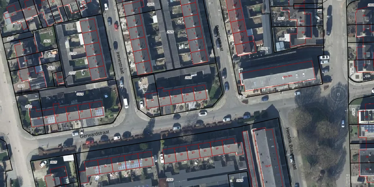 Gerwardstraat 38 is gelegen op kadastraal perceel GEN00A2928. Deze kadastrale aanduiding is uniek en wordt gebruikt door het Kadaster om eigendomsrechten en andere zakelijke rechten vast te leggen. Het perceel maakt onderdeel uit van de kadastrale gemeente Gendt.