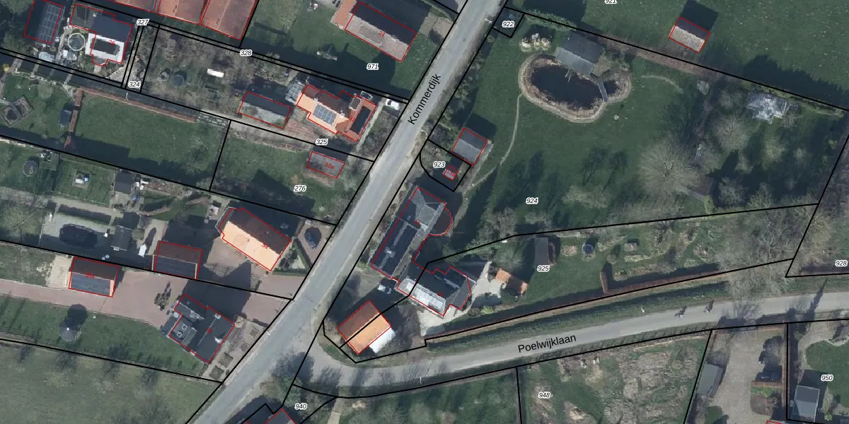 Het perceel waarop Kommerdijk 13 staat heeft een oppervlakte van 4165 m². Dit is een zeer groot perceel. De perceeloppervlakte wordt geregistreerd door het Kadaster. Gedetailleerde informatie over de maten van dit perceel kunt u vinden in het rapport Kadastrale kaart met maatvoering van Kommerdijk 13.
