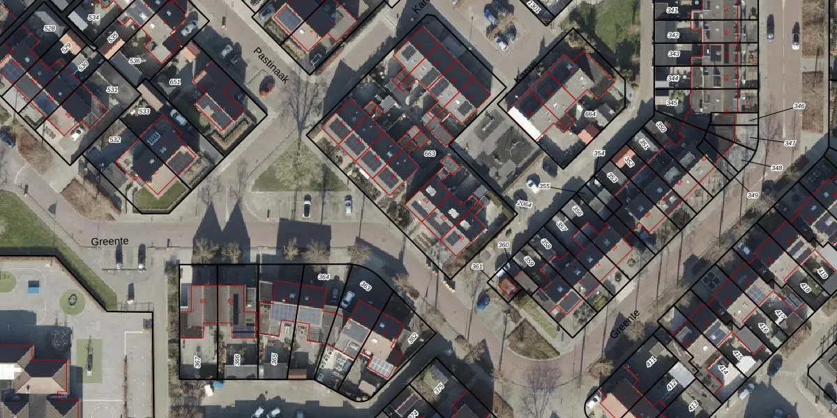 Het perceel waarop Greente 84 staat heeft een oppervlakte van 1597 m². Dit is een zeer groot perceel. De perceeloppervlakte wordt geregistreerd door het Kadaster. Gedetailleerde informatie over de maten van dit perceel kunt u vinden in het rapport Kadastrale kaart met maatvoering van Greente 84.