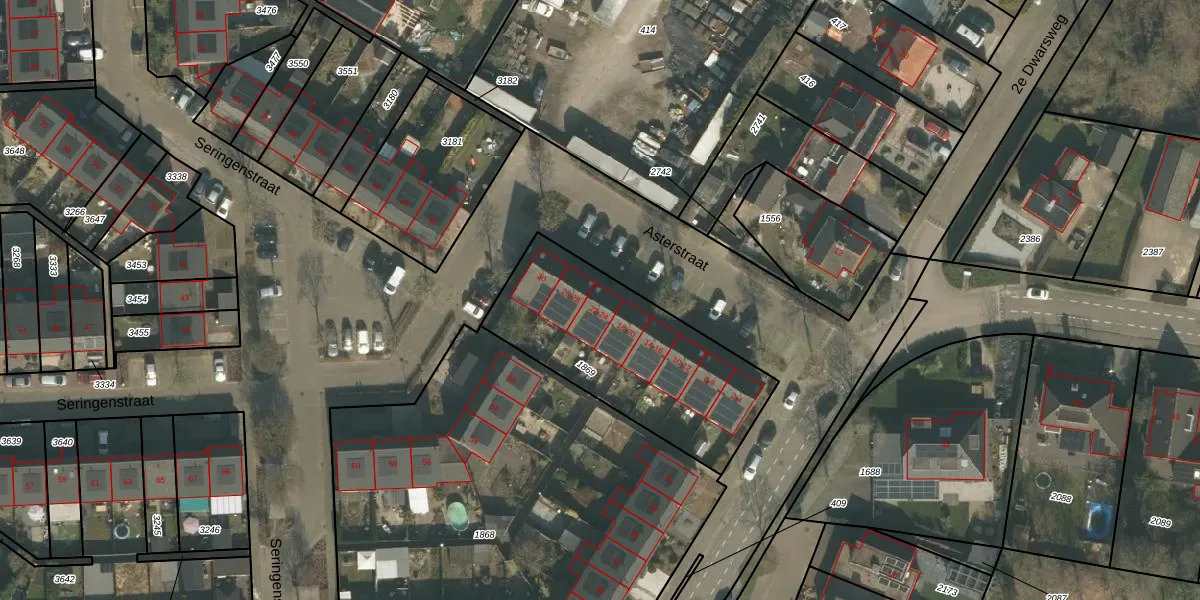 Het perceel waarop Asterstraat 24 staat heeft een oppervlakte van 853 m². Dit is een groot perceel. De perceeloppervlakte wordt geregistreerd door het Kadaster. Gedetailleerde informatie over de maten van dit perceel kunt u vinden in het rapport Kadastrale kaart met maatvoering van Asterstraat 24.