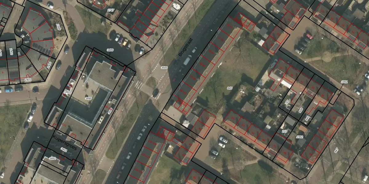 Het perceel waarop Brugstraat 100 staat heeft een oppervlakte van 3505 m². Dit is een zeer groot perceel. De perceeloppervlakte wordt geregistreerd door het Kadaster. Gedetailleerde informatie over de maten van dit perceel kunt u vinden in het rapport Kadastrale kaart met maatvoering van Brugstraat 100.