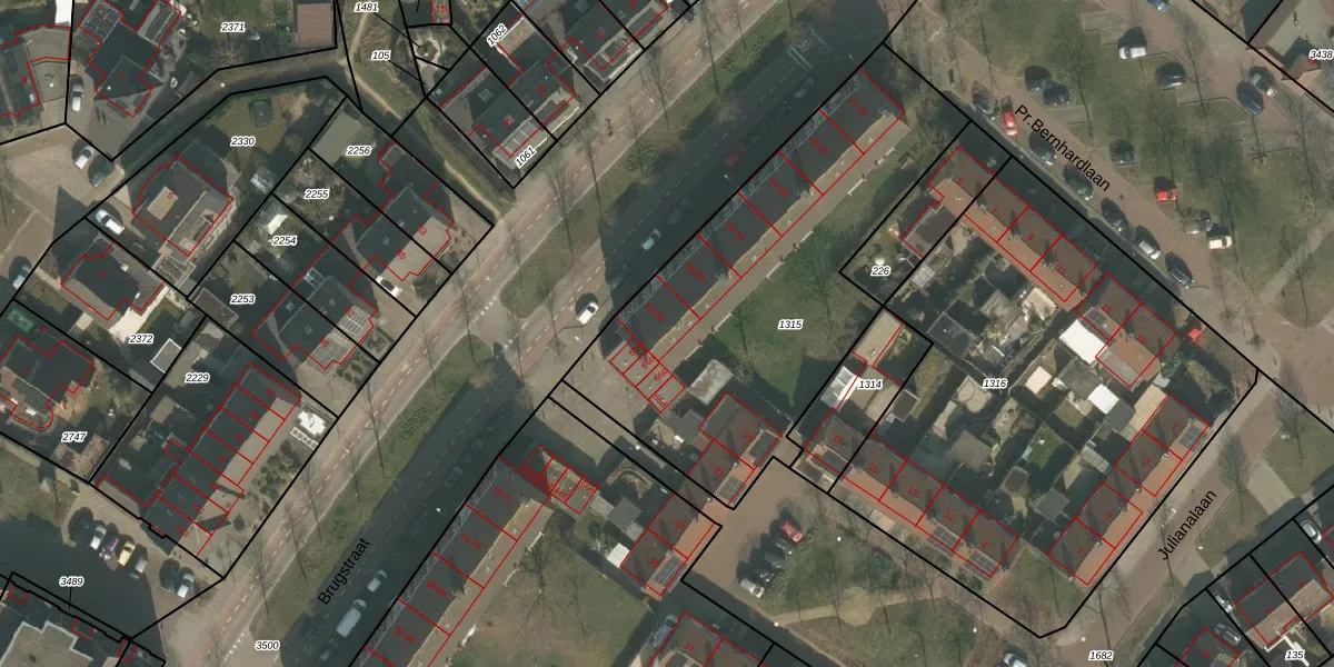 Het perceel waarop Brugstraat 66 staat heeft een oppervlakte van 1742 m². Dit is een zeer groot perceel. De perceeloppervlakte wordt geregistreerd door het Kadaster. Gedetailleerde informatie over de maten van dit perceel kunt u vinden in het rapport Kadastrale kaart met maatvoering van Brugstraat 66.