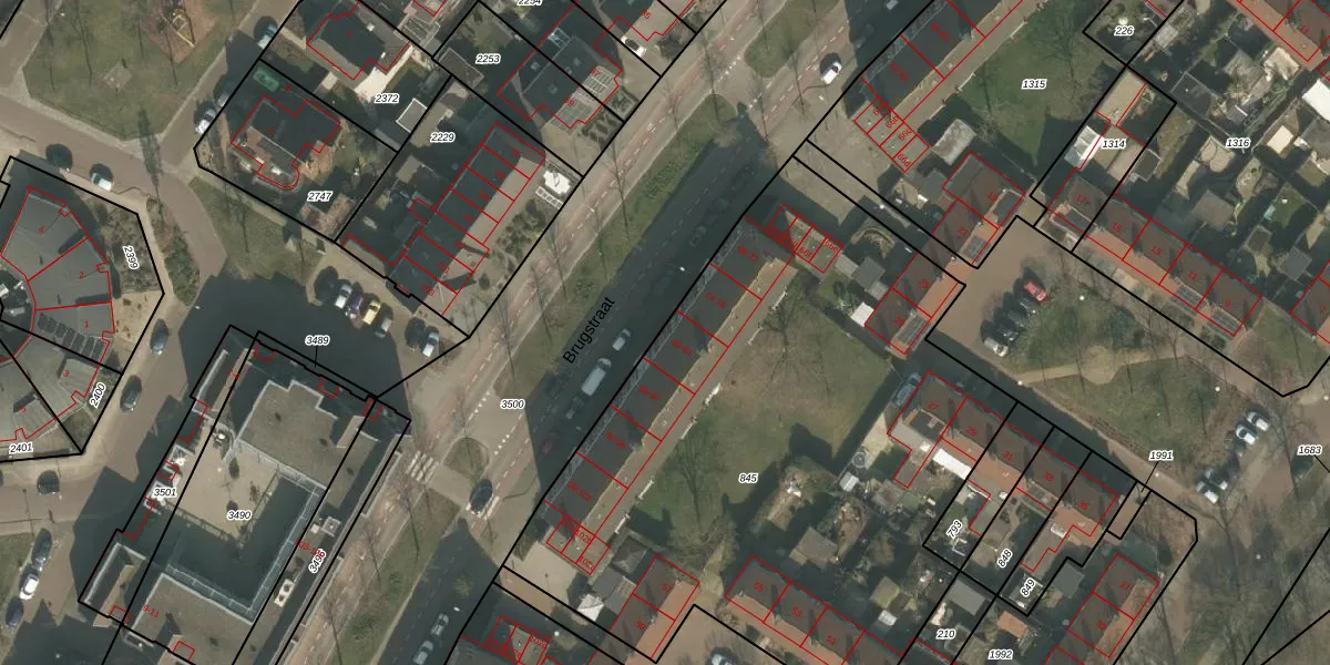 Het perceel waarop Brugstraat 80 staat heeft een oppervlakte van 3505 m². Dit is een zeer groot perceel. De perceeloppervlakte wordt geregistreerd door het Kadaster. Gedetailleerde informatie over de maten van dit perceel kunt u vinden in het rapport Kadastrale kaart met maatvoering van Brugstraat 80.