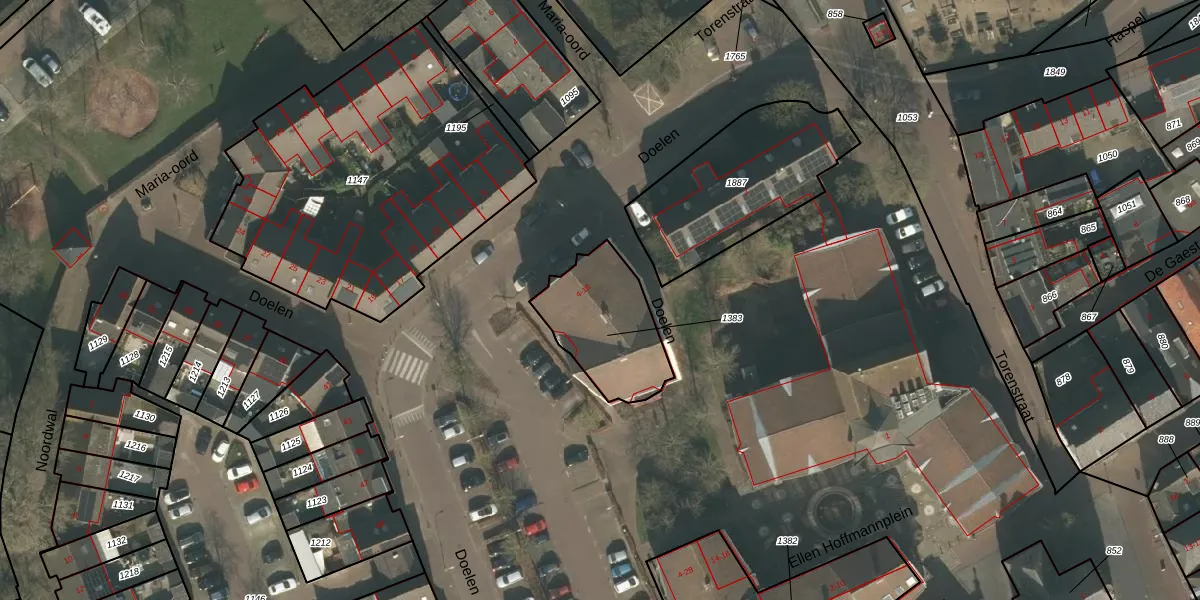 Het perceel waarop Doelen 12 staat heeft een oppervlakte van 364 m². Dit is een groot perceel. De perceeloppervlakte wordt geregistreerd door het Kadaster. Gedetailleerde informatie over de maten van dit perceel kunt u vinden in het rapport Kadastrale kaart met maatvoering van Doelen 12.