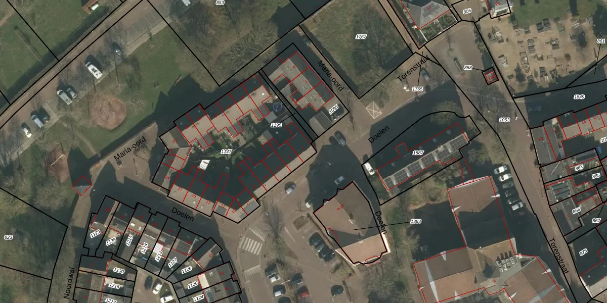 Het perceel waarop Doelen 7 staat heeft een oppervlakte van 1560 m². Dit is een zeer groot perceel. De perceeloppervlakte wordt geregistreerd door het Kadaster. Gedetailleerde informatie over de maten van dit perceel kunt u vinden in het rapport Kadastrale kaart met maatvoering van Doelen 7.