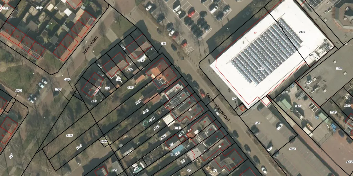 Duivenakkerstraat 21 is gelegen op kadastraal perceel GNP00D1645. Deze kadastrale aanduiding is uniek en wordt gebruikt door het Kadaster om eigendomsrechten en andere zakelijke rechten vast te leggen. Het perceel maakt onderdeel uit van de kadastrale gemeente Gennep.