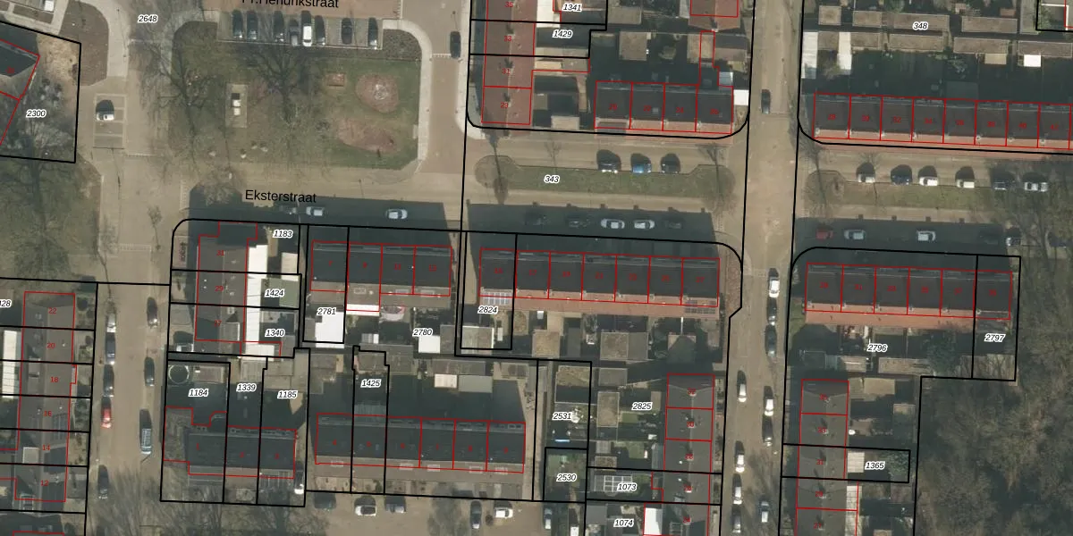 Het perceel waarop Eksterstraat 17 staat heeft een oppervlakte van 1492 m². Dit is een zeer groot perceel. De perceeloppervlakte wordt geregistreerd door het Kadaster. Gedetailleerde informatie over de maten van dit perceel kunt u vinden in het rapport Kadastrale kaart met maatvoering van Eksterstraat 17.