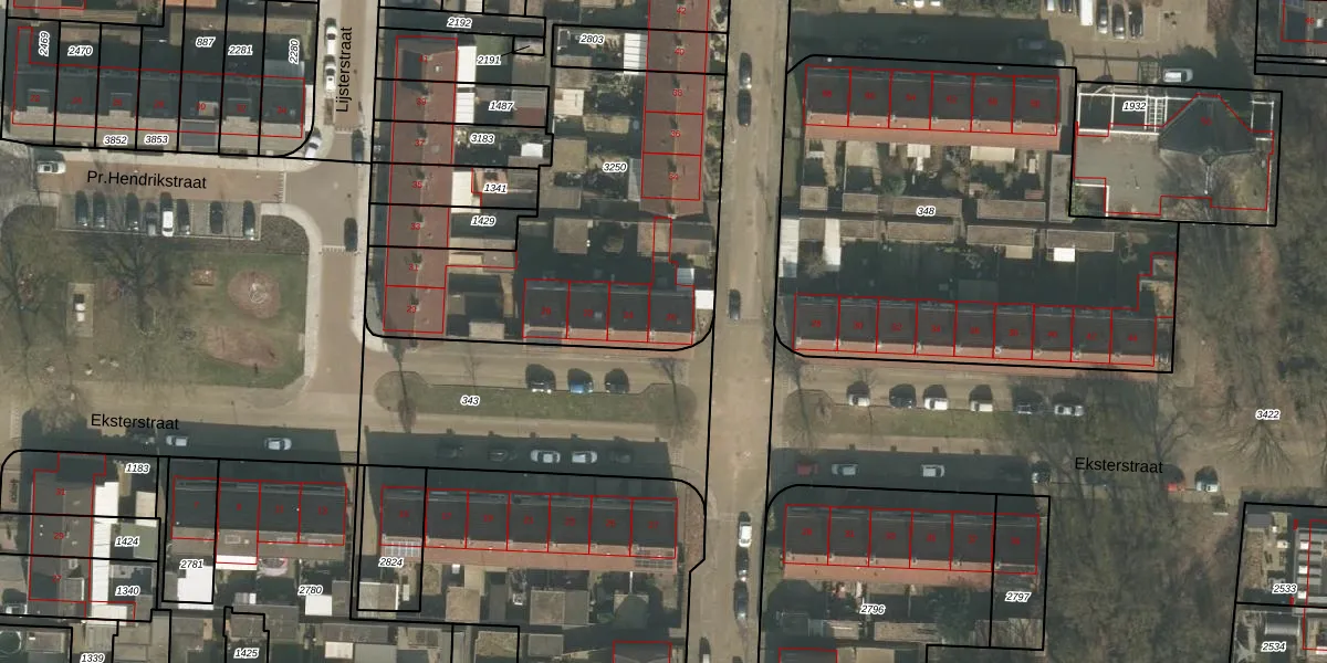 Het perceel waarop Eksterstraat 26 staat heeft een oppervlakte van 2118 m². Dit is een zeer groot perceel. De perceeloppervlakte wordt geregistreerd door het Kadaster. Gedetailleerde informatie over de maten van dit perceel kunt u vinden in het rapport Kadastrale kaart met maatvoering van Eksterstraat 26.