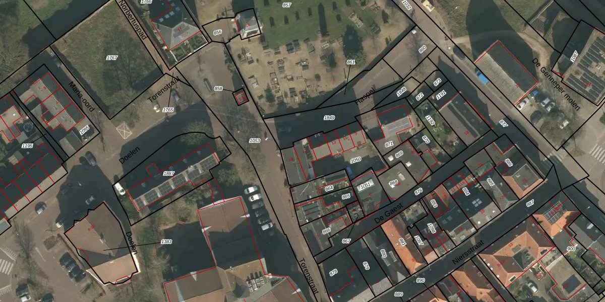 Het perceel waarop het adres ligt is GNP00-C-1050. De afkorting 'GNP00' staat voor kadastrale gemeente Gennep. De gemiddelde perceelgrootte in Gennep is 3620,07 m². Dit perceel is kleiner: de perceeloppervlakte bedraagt 460 m². Het grootste perceel in de kadastrale gemeente is 54,6 ha. Het kleinste perceel heeft een oppervlakte van 0 m². Op het perceel zijn 6 adressen aanwezig. De huidige grenzen van het perceel zijn digitaal in de Basisregistratie Kadaster (BRK) geregistreerd op 12-10-2007.