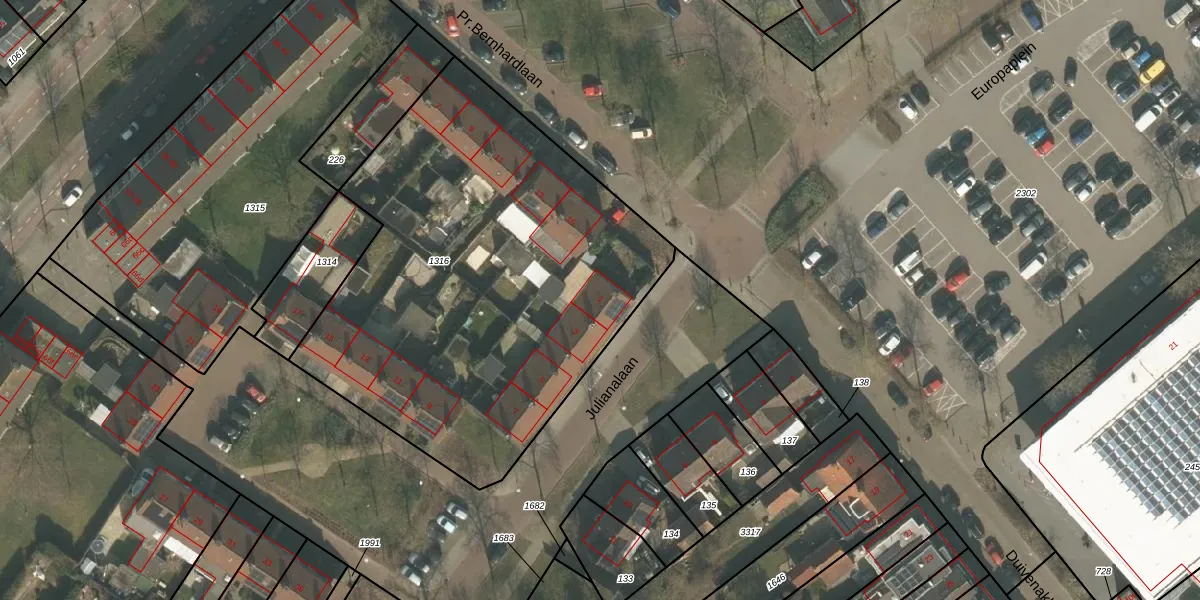 Het perceel waarop Julianalaan 1 staat heeft een oppervlakte van 2475 m². Dit is een zeer groot perceel. De perceeloppervlakte wordt geregistreerd door het Kadaster. Gedetailleerde informatie over de maten van dit perceel kunt u vinden in het rapport Kadastrale kaart met maatvoering van Julianalaan 1.