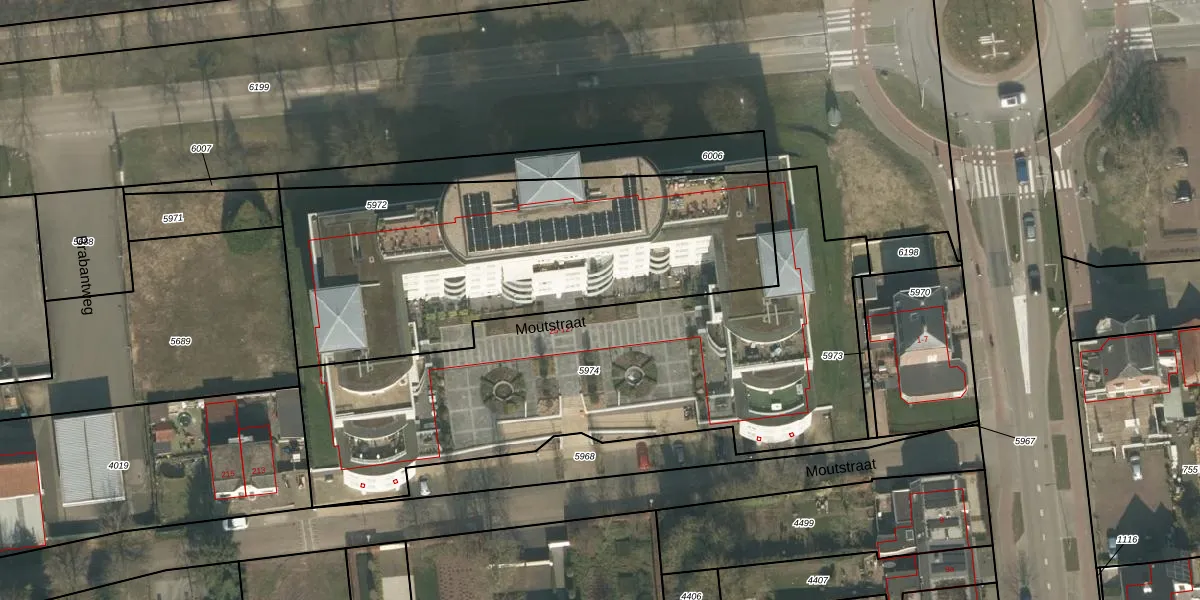 Moutstraat 57 is gelegen op kadastraal perceel GNP00B5972. Deze kadastrale aanduiding is uniek en wordt gebruikt door het Kadaster om eigendomsrechten en andere zakelijke rechten vast te leggen. Het perceel maakt onderdeel uit van de kadastrale gemeente Gennep.