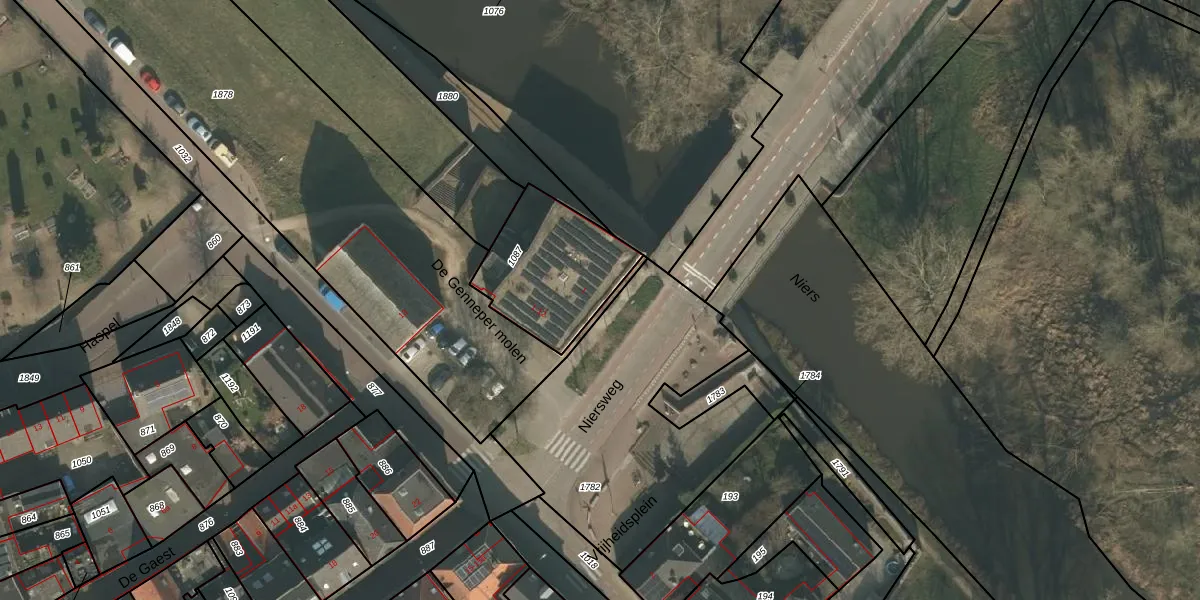 Niersweg 1 is gelegen op kadastraal perceel GNP00C1087. Deze kadastrale aanduiding is uniek en wordt gebruikt door het Kadaster om eigendomsrechten en andere zakelijke rechten vast te leggen. Het perceel maakt onderdeel uit van de kadastrale gemeente Gennep.