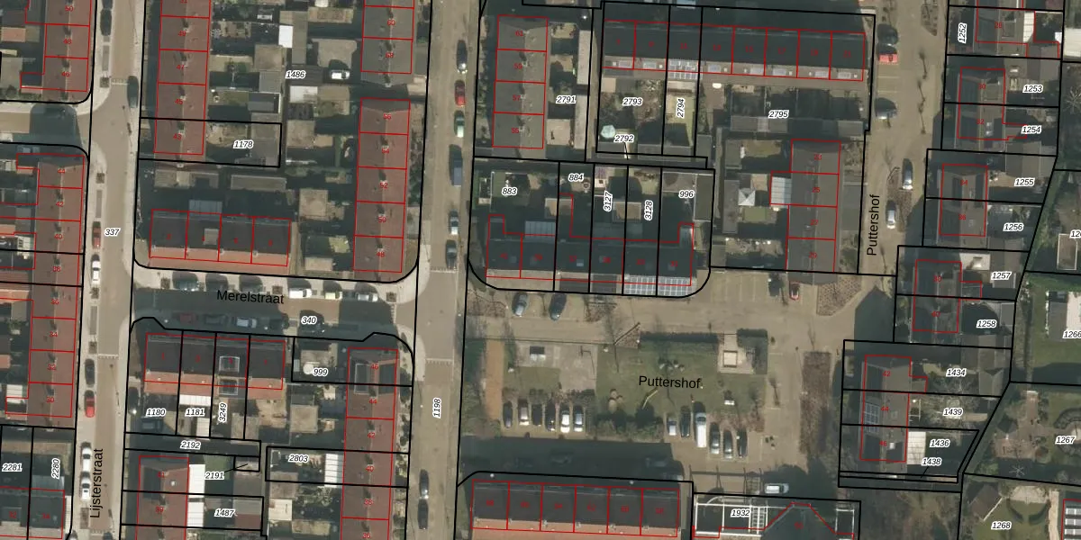 Het perceel waarop Puttershof 39 staat heeft een oppervlakte van 385 m². Dit is een groot perceel. De perceeloppervlakte wordt geregistreerd door het Kadaster. Gedetailleerde informatie over de maten van dit perceel kunt u vinden in het rapport Kadastrale kaart met maatvoering van Puttershof 39.