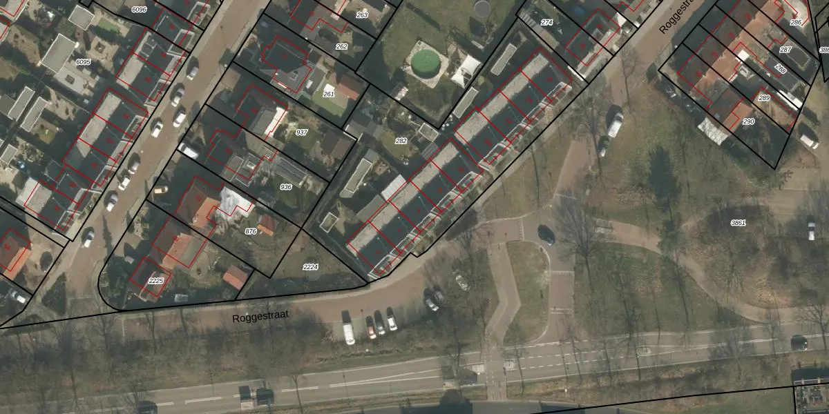 Het perceel waarop Roggestraat 6 staat heeft een oppervlakte van 1870 m². Dit is een zeer groot perceel. De perceeloppervlakte wordt geregistreerd door het Kadaster. Gedetailleerde informatie over de maten van dit perceel kunt u vinden in het rapport Kadastrale kaart met maatvoering van Roggestraat 6.