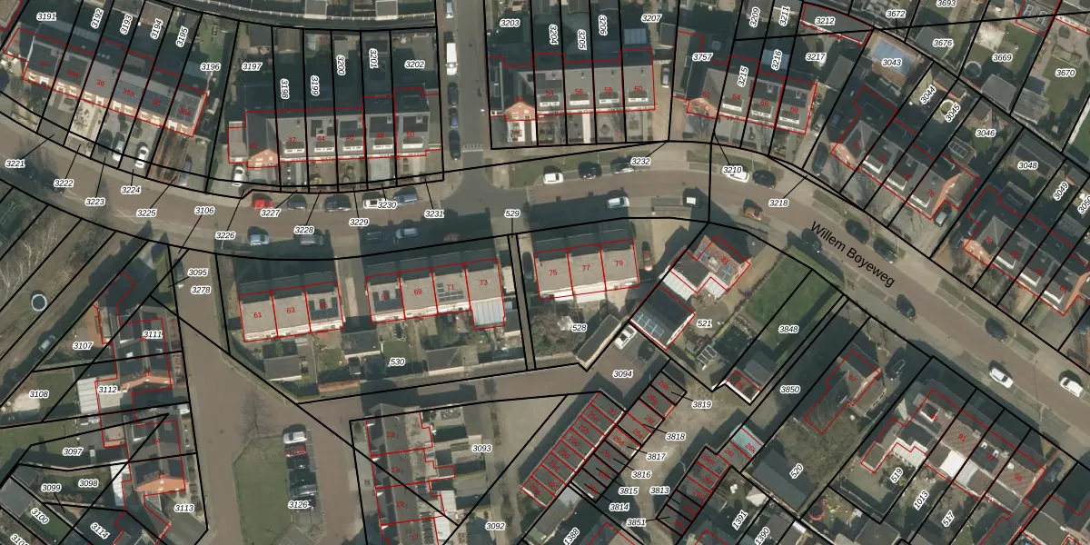 Het perceel waarop Willem Boyeweg 75 staat heeft een oppervlakte van 600 m². Dit is een groot perceel. De perceeloppervlakte wordt geregistreerd door het Kadaster. Gedetailleerde informatie over de maten van dit perceel kunt u vinden in het rapport Kadastrale kaart met maatvoering van Willem Boyeweg 75.