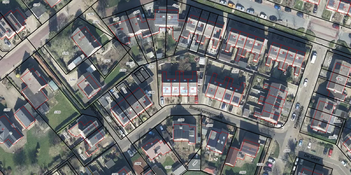 Het perceel waarop Bronkhorstermaat 14 staat heeft een oppervlakte van 3692 m². Dit is een zeer groot perceel. De perceeloppervlakte wordt geregistreerd door het Kadaster. Gedetailleerde informatie over de maten van dit perceel kunt u vinden in het rapport Kadastrale kaart met maatvoering van Bronkhorstermaat 14.