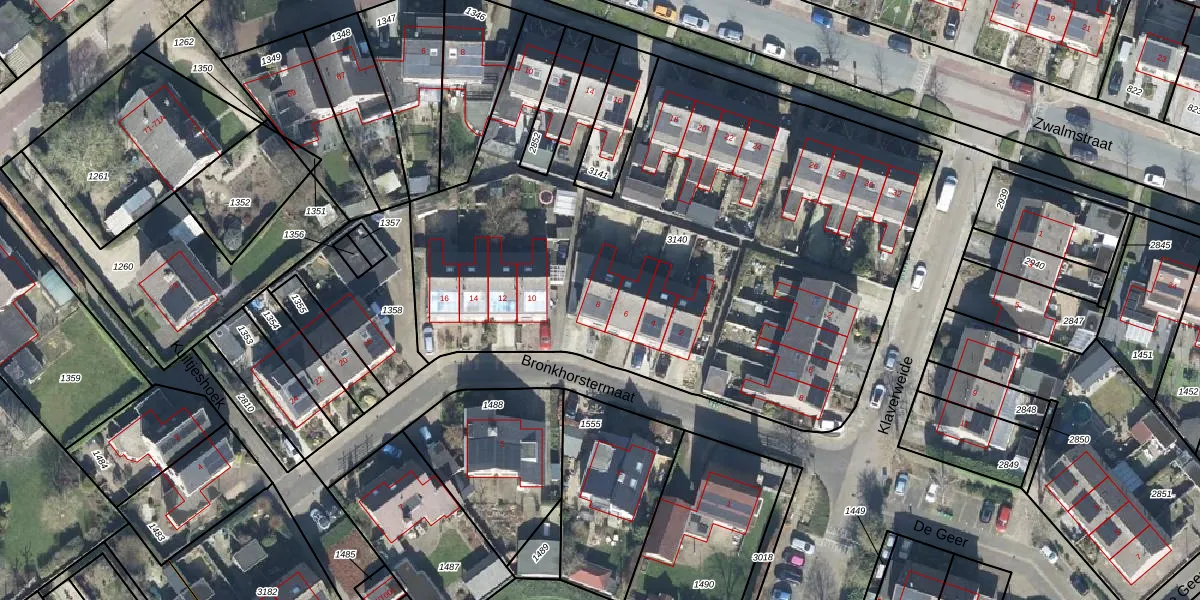 Het perceel waarop Bronkhorstermaat 8 staat heeft een oppervlakte van 3692 m². Dit is een zeer groot perceel. De perceeloppervlakte wordt geregistreerd door het Kadaster. Gedetailleerde informatie over de maten van dit perceel kunt u vinden in het rapport Kadastrale kaart met maatvoering van Bronkhorstermaat 8.