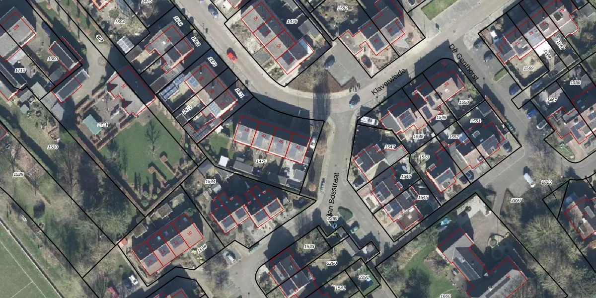 Klaverweide 43 is gelegen op kadastraal perceel BAH00E1470. Deze kadastrale aanduiding is uniek en wordt gebruikt door het Kadaster om eigendomsrechten en andere zakelijke rechten vast te leggen. Het perceel maakt onderdeel uit van de kadastrale gemeente Bahr en Lathum.