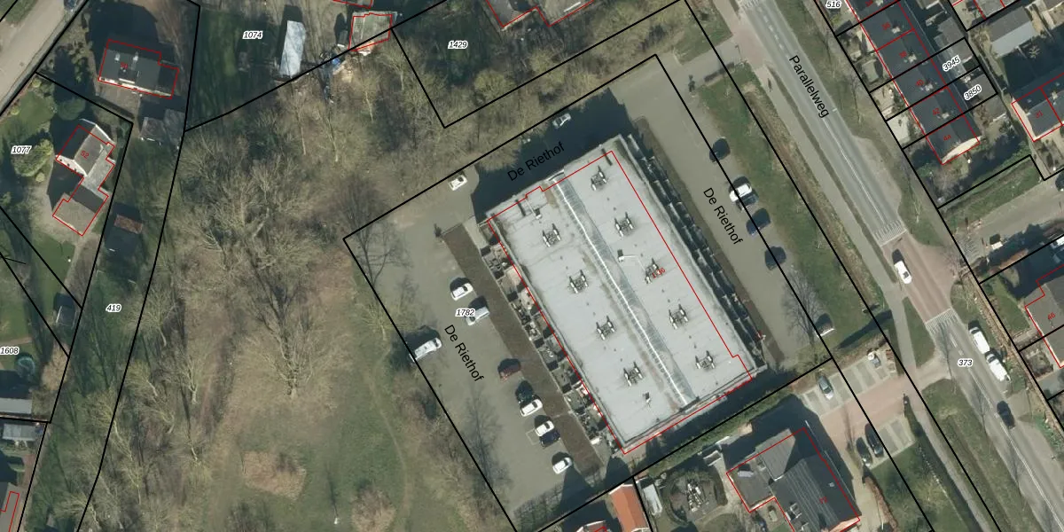 Het perceel waarop De Riethof 15 staat heeft een oppervlakte van 4486 m². Dit is een zeer groot perceel. De perceeloppervlakte wordt geregistreerd door het Kadaster. Gedetailleerde informatie over de maten van dit perceel kunt u vinden in het rapport Kadastrale kaart met maatvoering van De Riethof 15.
