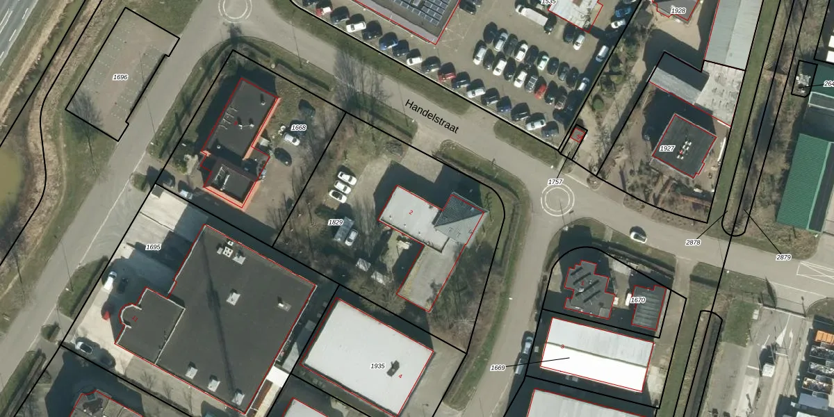 Het perceel waarop Handelstraat 2 staat heeft een oppervlakte van 1815 m². Dit is een zeer groot perceel. De perceeloppervlakte wordt geregistreerd door het Kadaster. Gedetailleerde informatie over de maten van dit perceel kunt u vinden in het rapport Kadastrale kaart met maatvoering van Handelstraat 2.