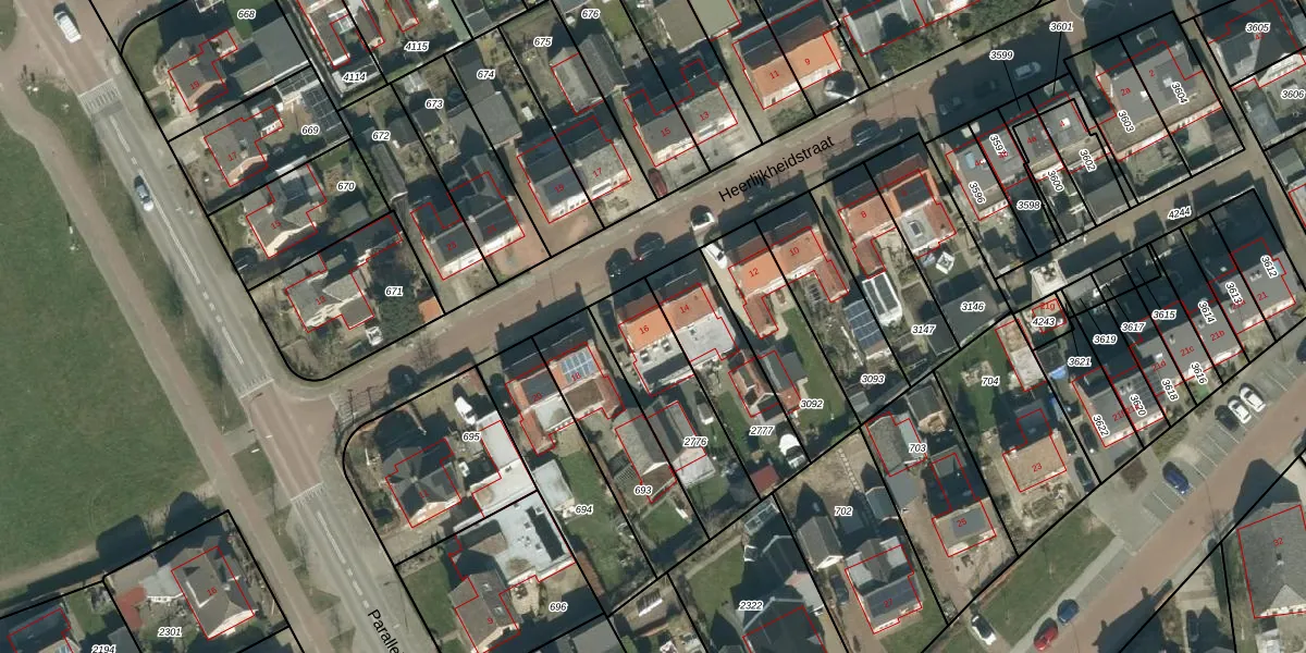 Het perceel waarop Heerlijkheidstraat 16 staat heeft een oppervlakte van 387 m². Dit is een groot perceel. De perceeloppervlakte wordt geregistreerd door het Kadaster. Gedetailleerde informatie over de maten van dit perceel kunt u vinden in het rapport Kadastrale kaart met maatvoering van Heerlijkheidstraat 16.