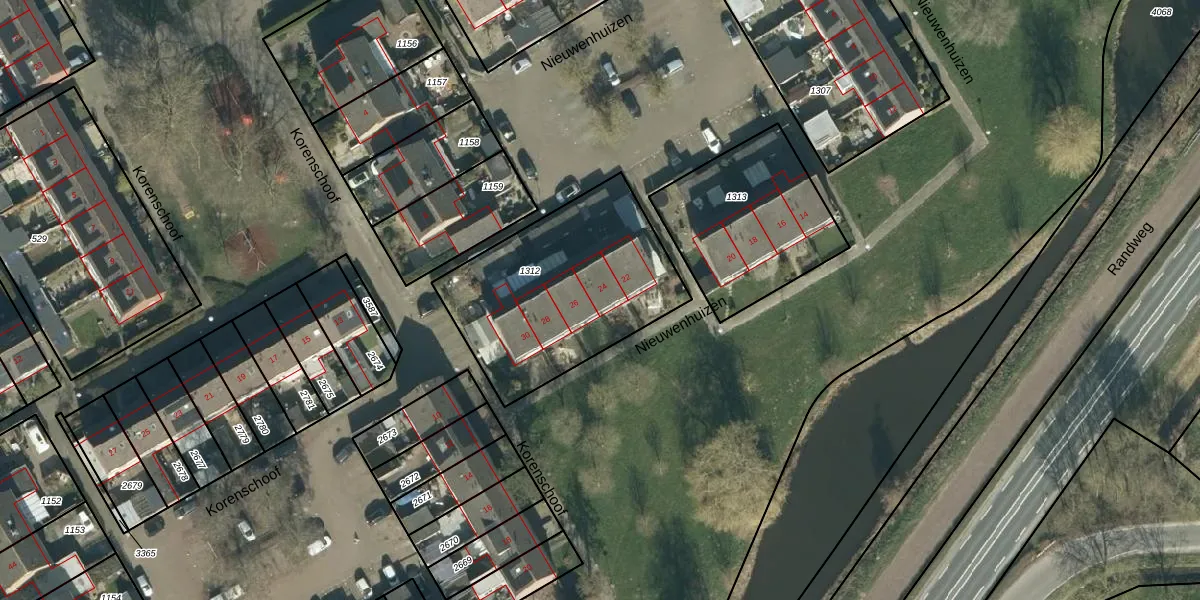 Het perceel waarop Nieuwenhuizen 24 staat heeft een oppervlakte van 863 m². Dit is een groot perceel. De perceeloppervlakte wordt geregistreerd door het Kadaster. Gedetailleerde informatie over de maten van dit perceel kunt u vinden in het rapport Kadastrale kaart met maatvoering van Nieuwenhuizen 24.
