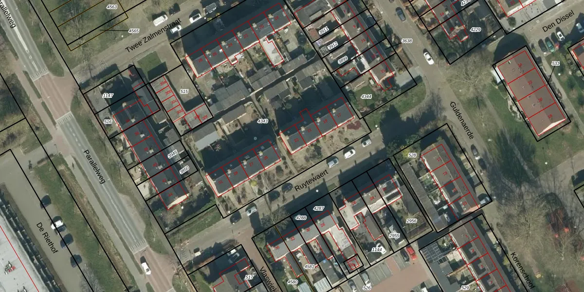 Het perceel waarop Ruytewaert 23 staat heeft een oppervlakte van 3554 m². Dit is een zeer groot perceel. De perceeloppervlakte wordt geregistreerd door het Kadaster. Gedetailleerde informatie over de maten van dit perceel kunt u vinden in het rapport Kadastrale kaart met maatvoering van Ruytewaert 23.