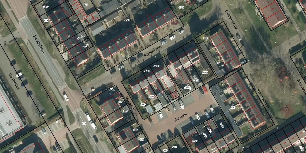 Het perceel waarop Ruytewaert 30 staat heeft een oppervlakte van 180 m². Dit is een middelgroot perceel. De perceeloppervlakte wordt geregistreerd door het Kadaster. Gedetailleerde informatie over de maten van dit perceel kunt u vinden in het rapport Kadastrale kaart met maatvoering van Ruytewaert 30.