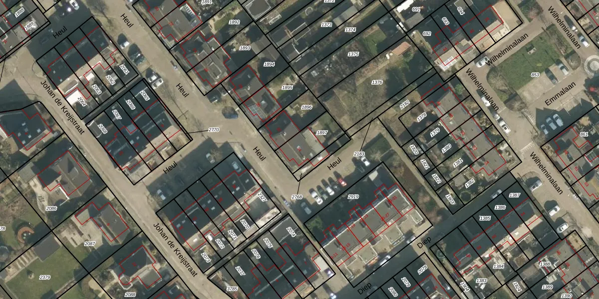 Het perceel waarop Heul 34 staat heeft een oppervlakte van 216 m². Dit is een middelgroot perceel. De perceeloppervlakte wordt geregistreerd door het Kadaster. Gedetailleerde informatie over de maten van dit perceel kunt u vinden in het rapport Kadastrale kaart met maatvoering van Heul 34.