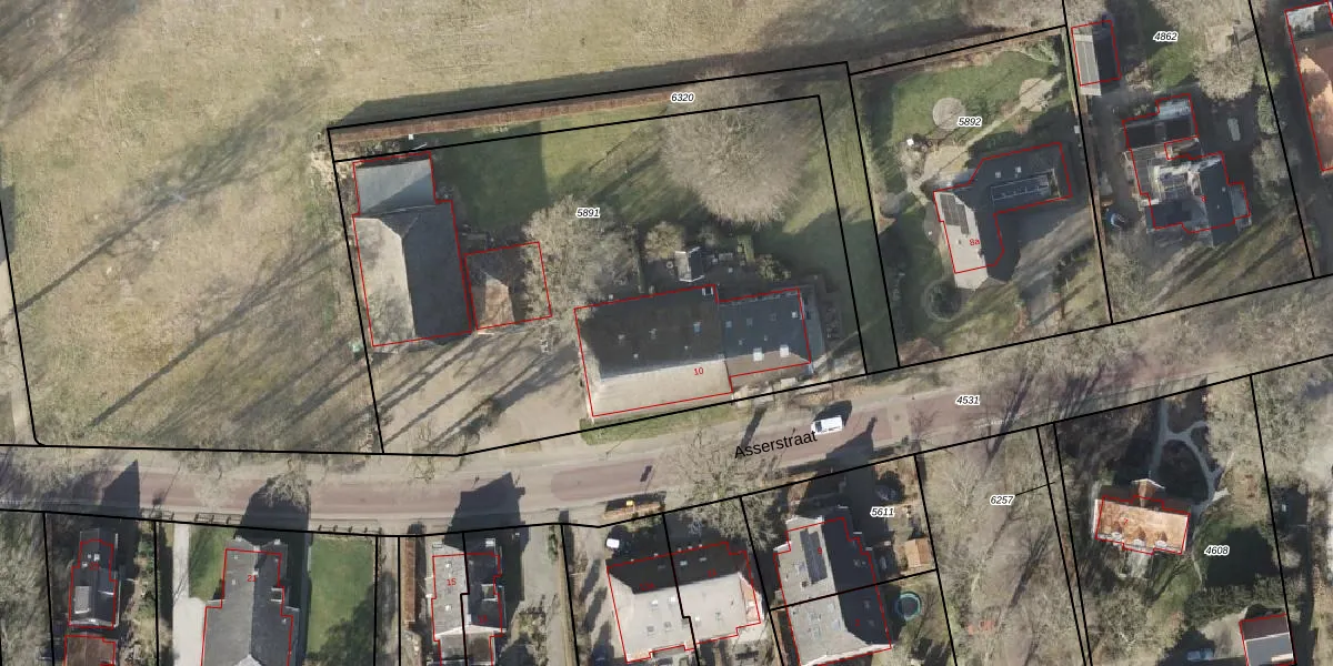Asserstraat 10 is gelegen op kadastraal perceel GTN00E5891. Deze kadastrale aanduiding is uniek en wordt gebruikt door het Kadaster om eigendomsrechten en andere zakelijke rechten vast te leggen. Het perceel maakt onderdeel uit van de kadastrale gemeente Gieten.