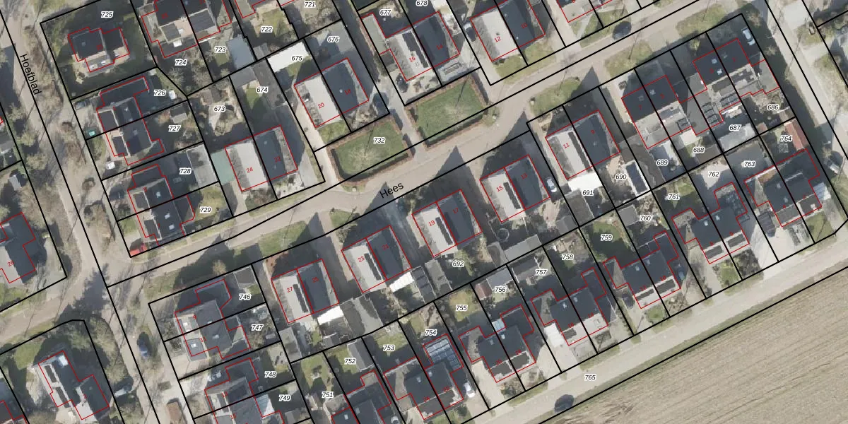Het perceel waarop Hees 19 staat heeft een oppervlakte van 1892 m². Dit is een zeer groot perceel. De perceeloppervlakte wordt geregistreerd door het Kadaster. Gedetailleerde informatie over de maten van dit perceel kunt u vinden in het rapport Kadastrale kaart met maatvoering van Hees 19.