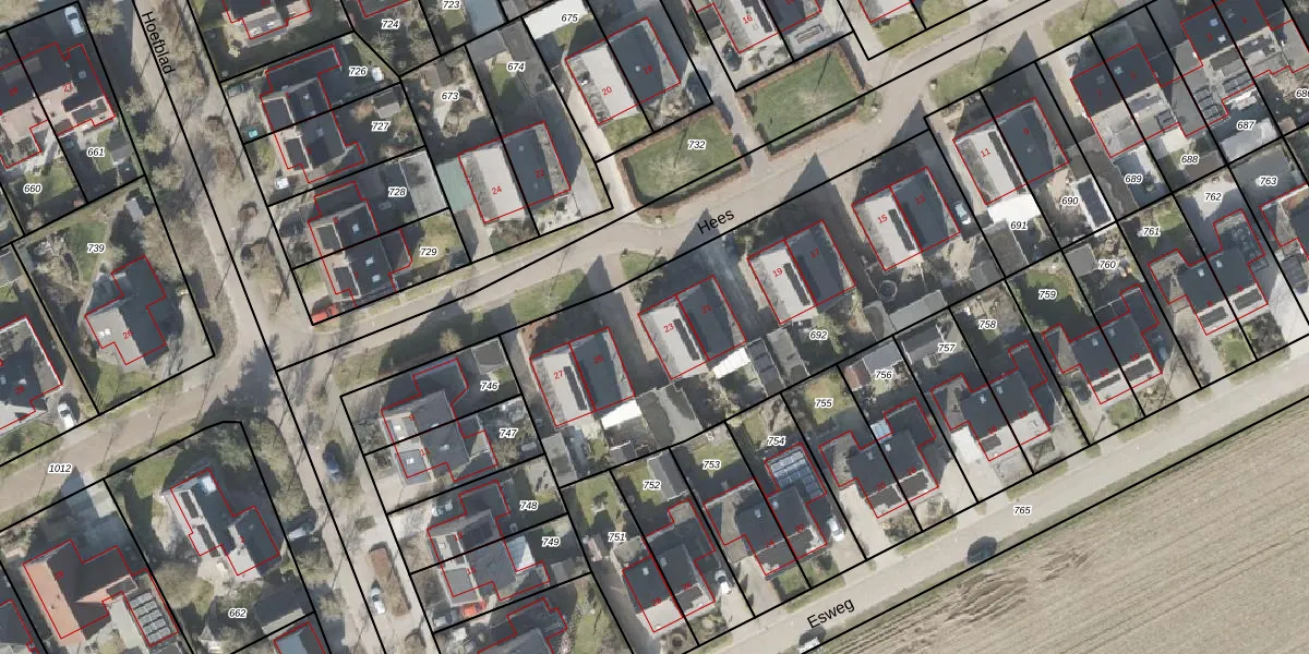 Het perceel waarop Hees 23 staat heeft een oppervlakte van 1892 m². Dit is een zeer groot perceel. De perceeloppervlakte wordt geregistreerd door het Kadaster. Gedetailleerde informatie over de maten van dit perceel kunt u vinden in het rapport Kadastrale kaart met maatvoering van Hees 23.