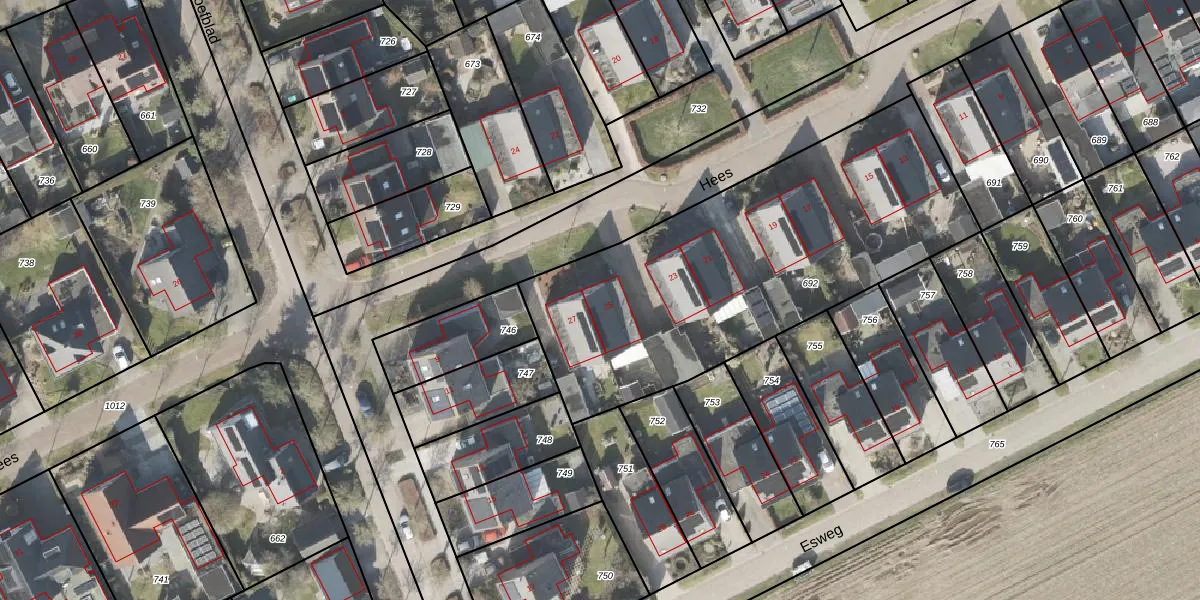Het perceel waarop Hees 25 staat heeft een oppervlakte van 1892 m². Dit is een zeer groot perceel. De perceeloppervlakte wordt geregistreerd door het Kadaster. Gedetailleerde informatie over de maten van dit perceel kunt u vinden in het rapport Kadastrale kaart met maatvoering van Hees 25.