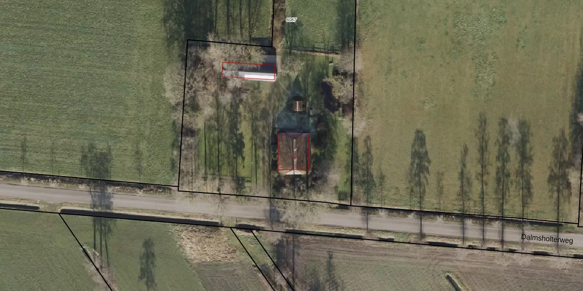 Het perceel waarop Dalmsholterweg 8 staat heeft een oppervlakte van 6030 m². Dit is een zeer groot perceel. De perceeloppervlakte wordt geregistreerd door het Kadaster. Gedetailleerde informatie over de maten van dit perceel kunt u vinden in het rapport Kadastrale kaart met maatvoering van Dalmsholterweg 8.