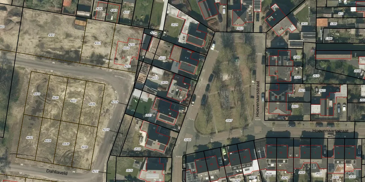 Het perceel waarop Hoevenaarsstraat 26 staat heeft een oppervlakte van 402 m². Dit is een groot perceel. De perceeloppervlakte wordt geregistreerd door het Kadaster. Gedetailleerde informatie over de maten van dit perceel kunt u vinden in het rapport Kadastrale kaart met maatvoering van Hoevenaarsstraat 26.