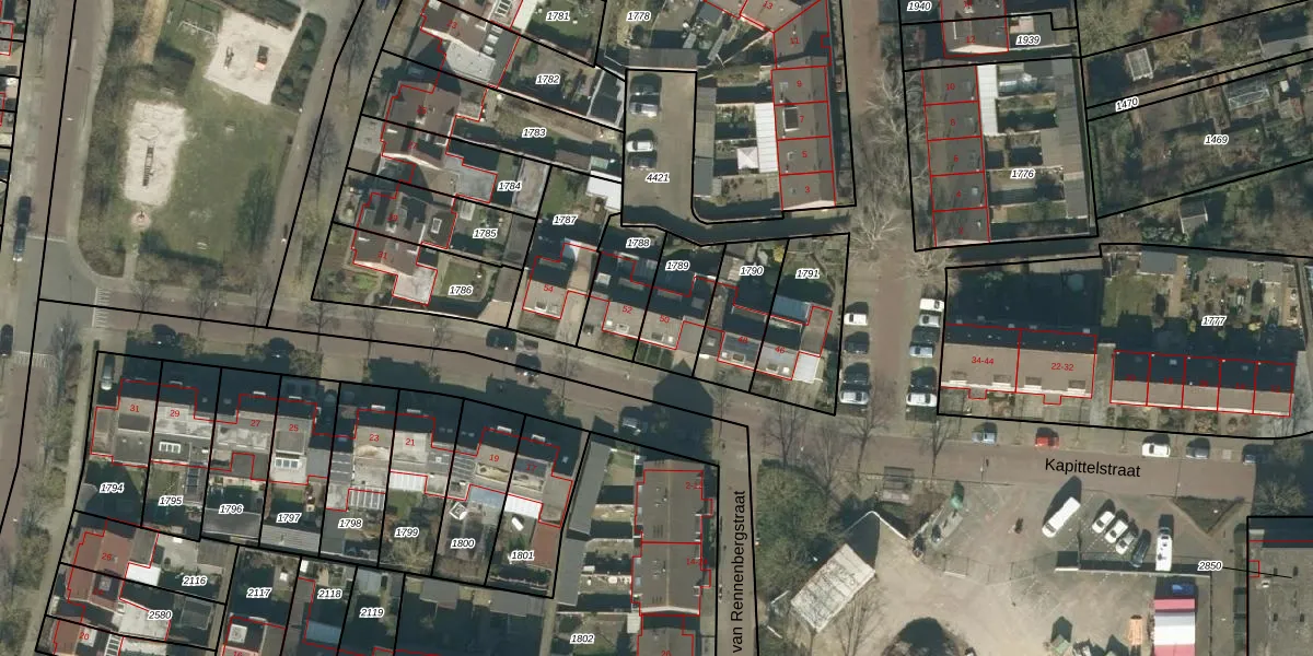 Het perceel waarop Kapittelstraat 50 staat heeft een oppervlakte van 185 m². Dit is een middelgroot perceel. De perceeloppervlakte wordt geregistreerd door het Kadaster. Gedetailleerde informatie over de maten van dit perceel kunt u vinden in het rapport Kadastrale kaart met maatvoering van Kapittelstraat 50.