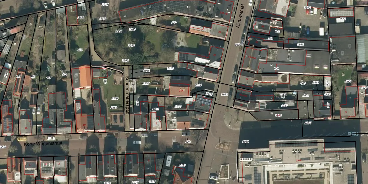 Het perceel waarop Nieuwstraat 27-A staat heeft een oppervlakte van 443 m². Dit is een groot perceel. De perceeloppervlakte wordt geregistreerd door het Kadaster. Gedetailleerde informatie over de maten van dit perceel kunt u vinden in het rapport Kadastrale kaart met maatvoering van Nieuwstraat 27-A.
