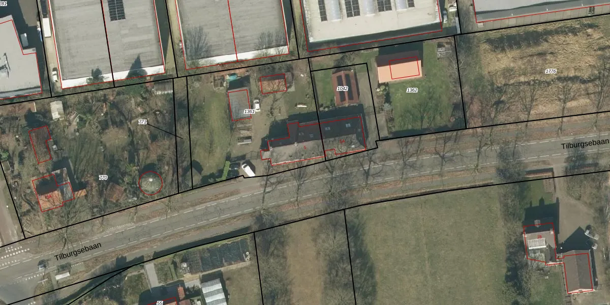 Het perceel waarop Tilburgsebaan 5 staat heeft een oppervlakte van 1505 m². Dit is een zeer groot perceel. De perceeloppervlakte wordt geregistreerd door het Kadaster. Gedetailleerde informatie over de maten van dit perceel kunt u vinden in het rapport Kadastrale kaart met maatvoering van Tilburgsebaan 5.
