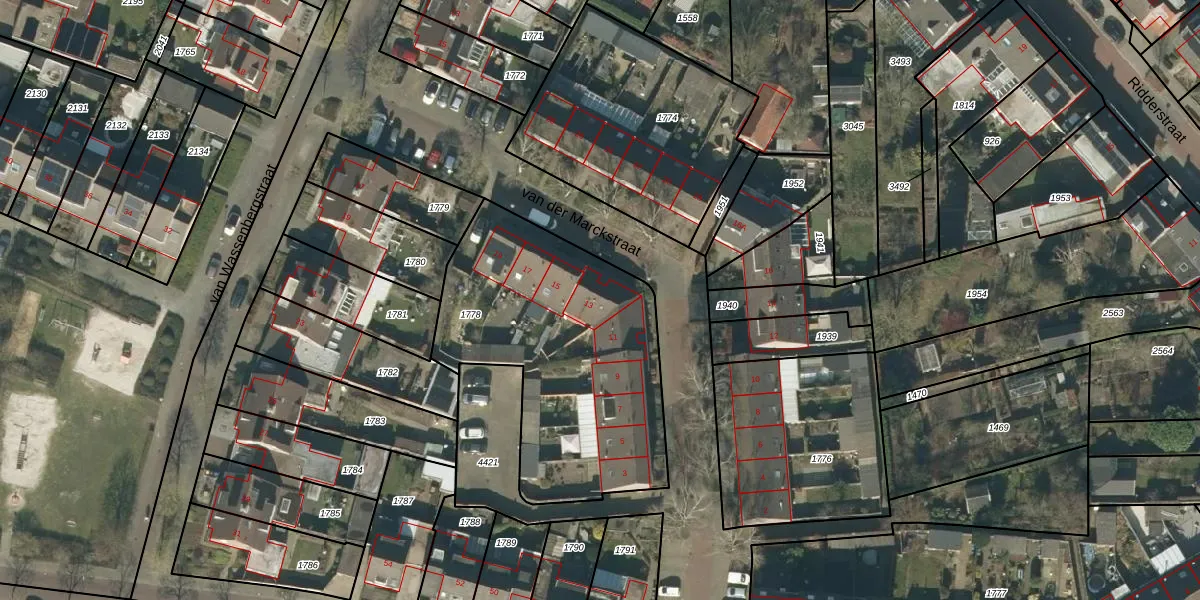 Het perceel waarop van der Marckstraat 13 staat heeft een oppervlakte van 1265 m². Dit is een zeer groot perceel. De perceeloppervlakte wordt geregistreerd door het Kadaster. Gedetailleerde informatie over de maten van dit perceel kunt u vinden in het rapport Kadastrale kaart met maatvoering van van der Marckstraat 13.