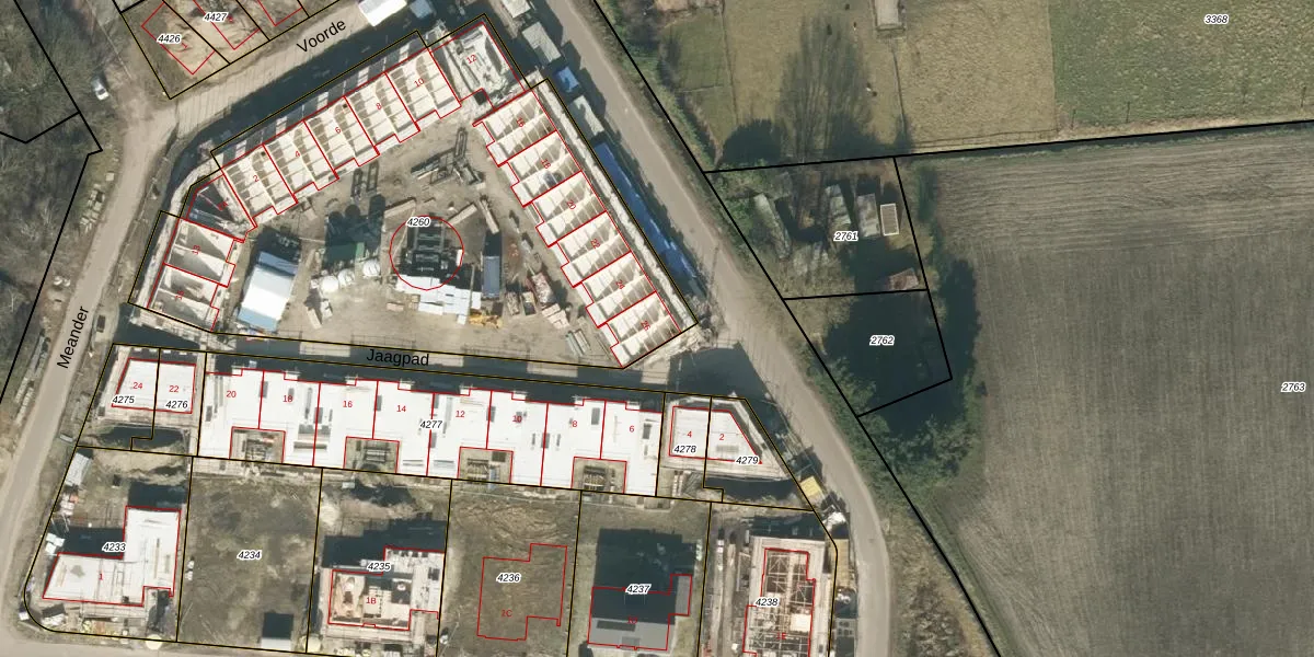 Het perceel waarop Veldstraat 26 staat heeft een oppervlakte van 2863 m². Dit is een zeer groot perceel. De perceeloppervlakte wordt geregistreerd door het Kadaster. Gedetailleerde informatie over de maten van dit perceel kunt u vinden in het rapport Kadastrale kaart met maatvoering van Veldstraat 26.