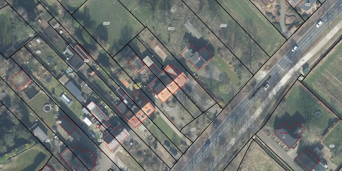 Glanerbrugstraat 56 is gelegen op kadastraal perceel LSR00Q407. Deze kadastrale aanduiding is uniek en wordt gebruikt door het Kadaster om eigendomsrechten en andere zakelijke rechten vast te leggen. Het perceel maakt onderdeel uit van de kadastrale gemeente Losser.