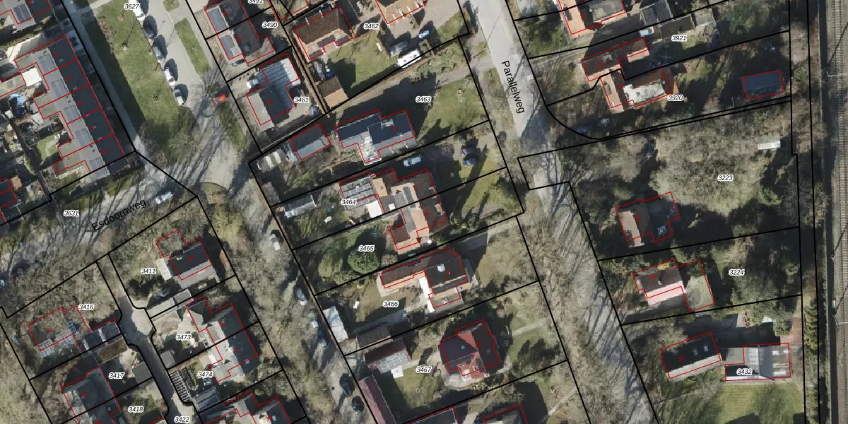 Parallelweg 19 is gelegen op kadastraal perceel HRN01H3465. Deze kadastrale aanduiding is uniek en wordt gebruikt door het Kadaster om eigendomsrechten en andere zakelijke rechten vast te leggen. Het perceel maakt onderdeel uit van de kadastrale gemeente Haren.