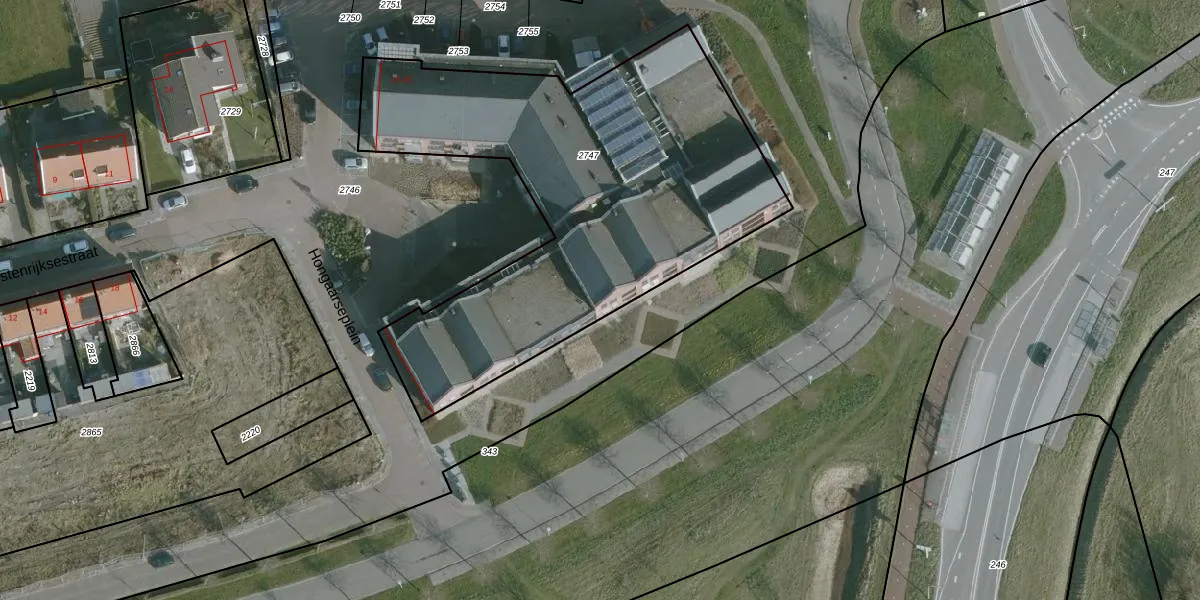 Het perceel waarop Hongaarseplein 33 staat heeft een oppervlakte van 2255 m². Dit is een zeer groot perceel. De perceeloppervlakte wordt geregistreerd door het Kadaster. Gedetailleerde informatie over de maten van dit perceel kunt u vinden in het rapport Kadastrale kaart met maatvoering van Hongaarseplein 33.