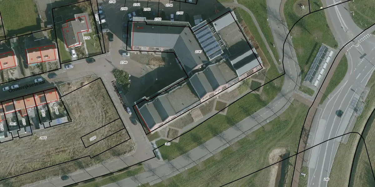 Het perceel waarop Hongaarseplein 66 staat heeft een oppervlakte van 2255 m². Dit is een zeer groot perceel. De perceeloppervlakte wordt geregistreerd door het Kadaster. Gedetailleerde informatie over de maten van dit perceel kunt u vinden in het rapport Kadastrale kaart met maatvoering van Hongaarseplein 66.