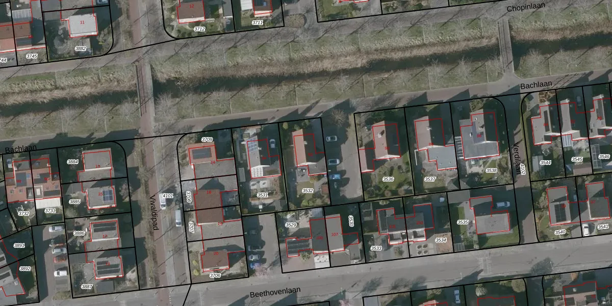 Het perceel waarop Bachlaan 92 staat heeft een oppervlakte van 407 m². Dit is een groot perceel. De perceeloppervlakte wordt geregistreerd door het Kadaster. Gedetailleerde informatie over de maten van dit perceel kunt u vinden in het rapport Kadastrale kaart met maatvoering van Bachlaan 92.