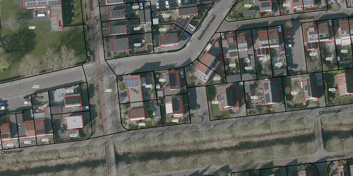 Het perceel waarop Beethovenlaan 1 staat heeft een oppervlakte van 265 m². Dit is een middelgroot perceel. De perceeloppervlakte wordt geregistreerd door het Kadaster. Gedetailleerde informatie over de maten van dit perceel kunt u vinden in het rapport Kadastrale kaart met maatvoering van Beethovenlaan 1.
