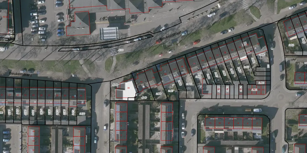 Beukenstraat 43 is gelegen op kadastraal perceel GOE00E2468. Deze kadastrale aanduiding is uniek en wordt gebruikt door het Kadaster om eigendomsrechten en andere zakelijke rechten vast te leggen. Het perceel maakt onderdeel uit van de kadastrale gemeente Goes.