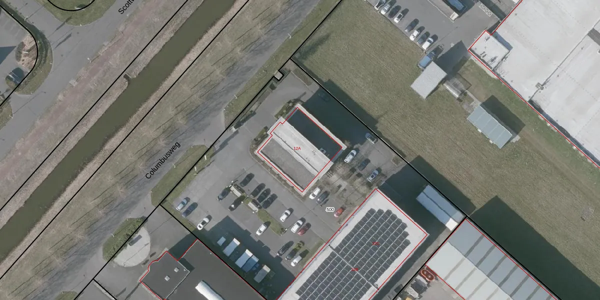 Het perceel waarop Columbusweg 12-A staat heeft een oppervlakte van 5155 m². Dit is een zeer groot perceel. De perceeloppervlakte wordt geregistreerd door het Kadaster. Gedetailleerde informatie over de maten van dit perceel kunt u vinden in het rapport Kadastrale kaart met maatvoering van Columbusweg 12-A.